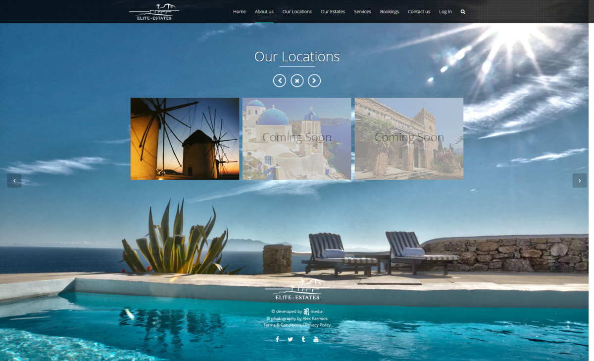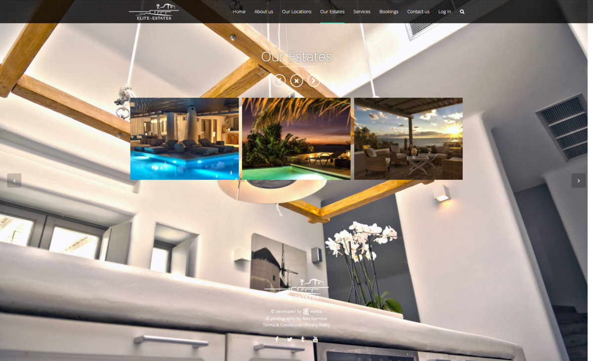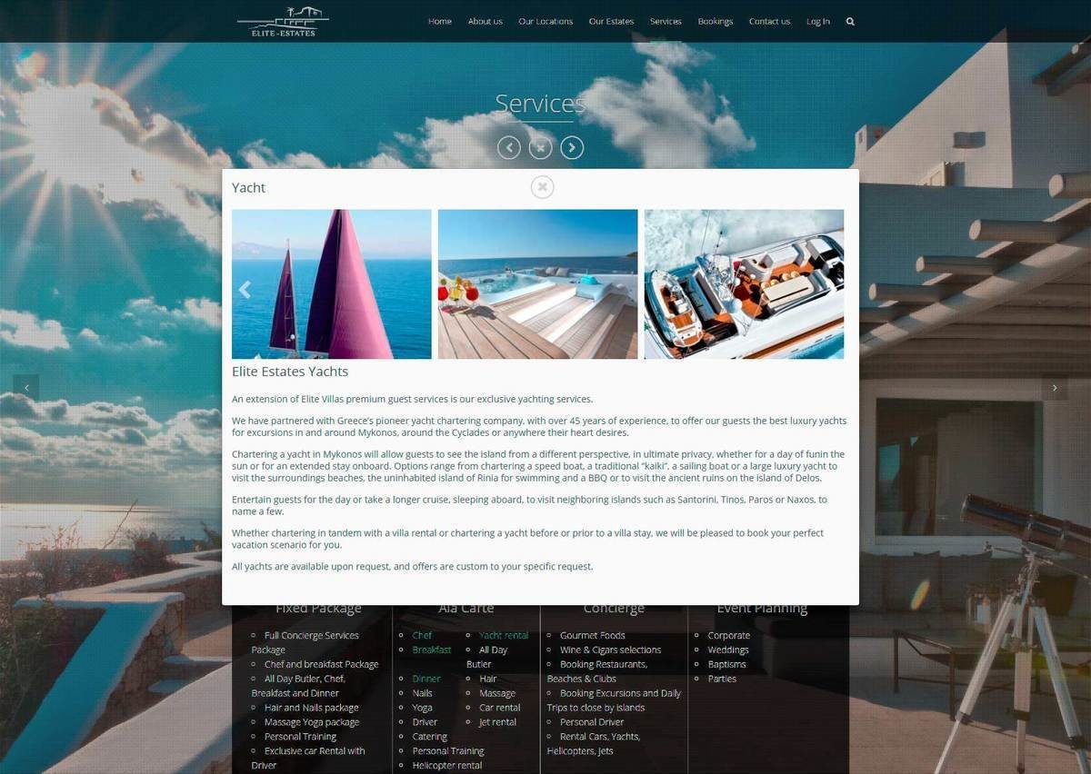 Designing, developing and hosting the website for Elite Estates luxury villas company in Mykonos. This is one of our first designs. A rather simple but beautiful design, with a complicated custom-made VIP members area. Featuring their services, biography, crew, contact form, photo galleries and slide-shows, socials and more. All in a very lively and interactive modern page set up with all the latest technologies that are trending, to provide the best and most memorable user experience for the visitor of the website. The whole design was based on a WP CMS but we modified it completely, like if we created it from scratch. We also created a custom-made private booking system where a user requests approval first as a member, before being able to access more areas and make reservations, book dates or request any services on-line. We also did the logo design and id branding campaign for the company. All location and architecture photography provides from us as well.