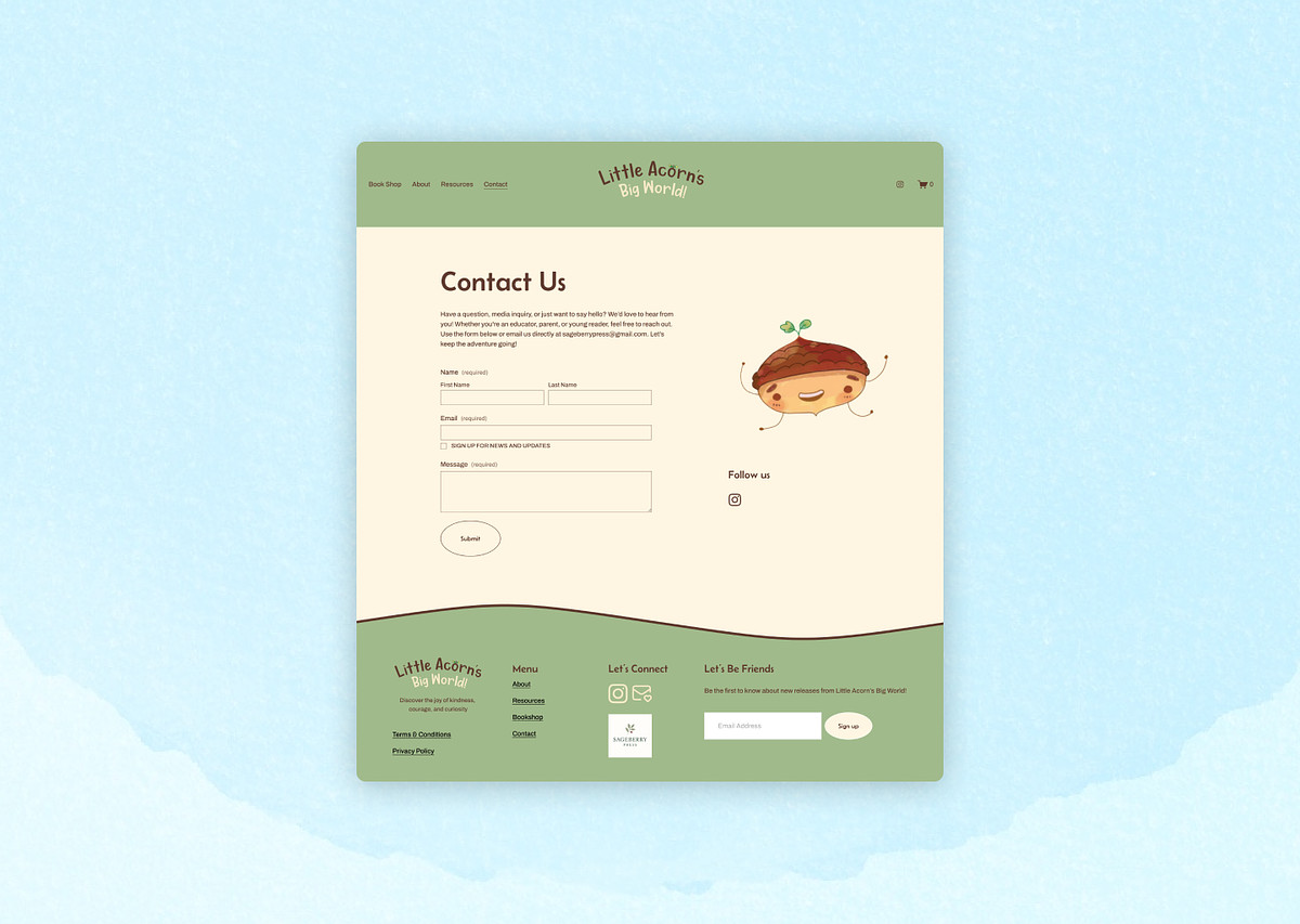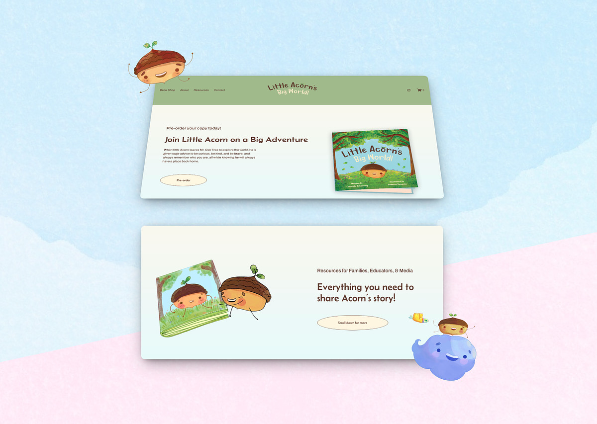 Squarespace website design for children’s storybook series Little Acorn’s Big World. The site was designed to feel playful, gentle, and inviting, reflecting the heart of the stories themselves.
