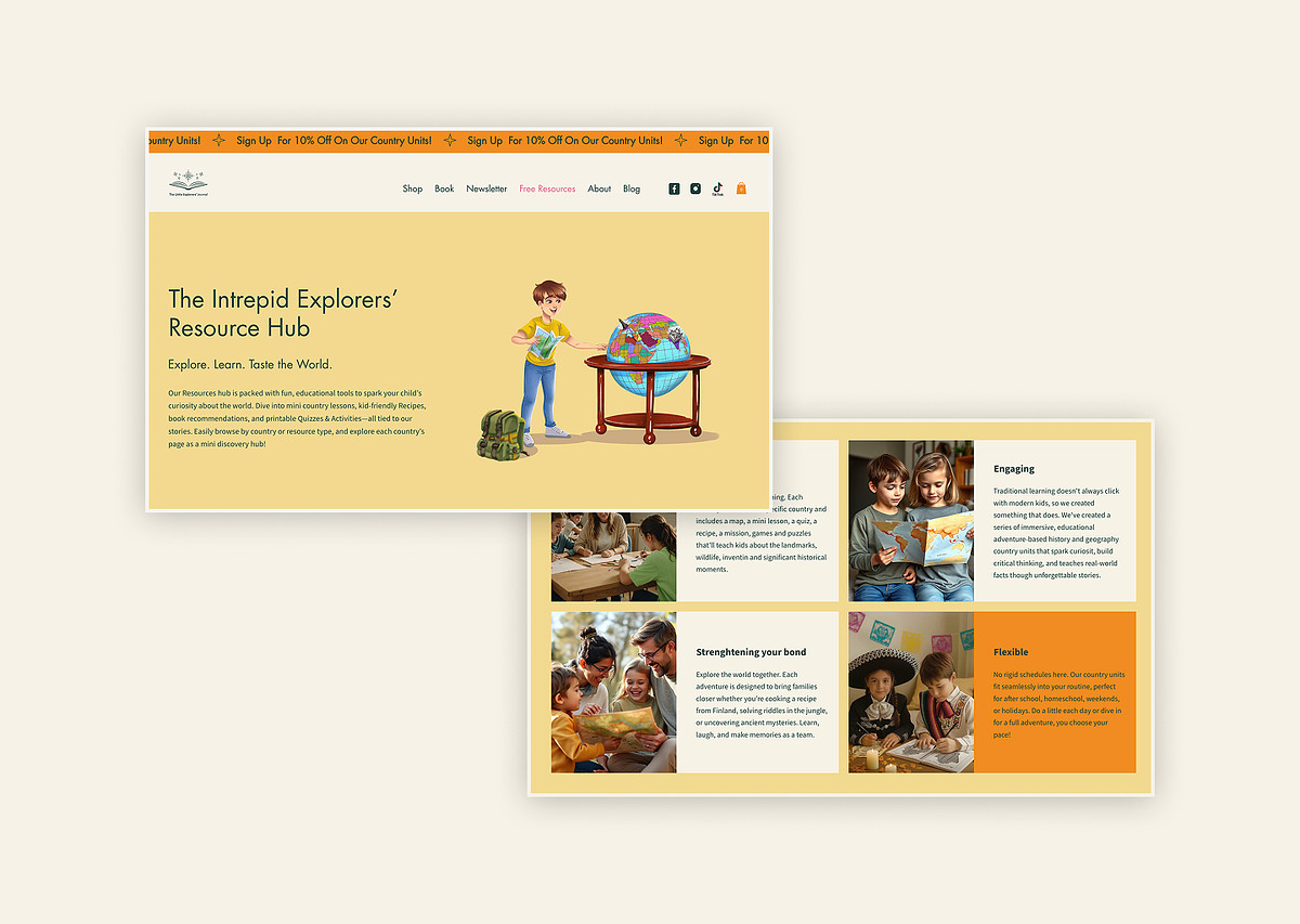 Wix Studio website design for children’s adventure book series Little Explorer’s Journal. The site combines playful, adventurous design with practical functionality, including an integrated shop and a CMS for downloadable guides and educational resources. It’s fully synced with Mailchimp, Amazon, and Trustpilot to streamline marketing, sales, and customer feedback, while creating an engaging, easy-to-navigate space for young readers and their families.