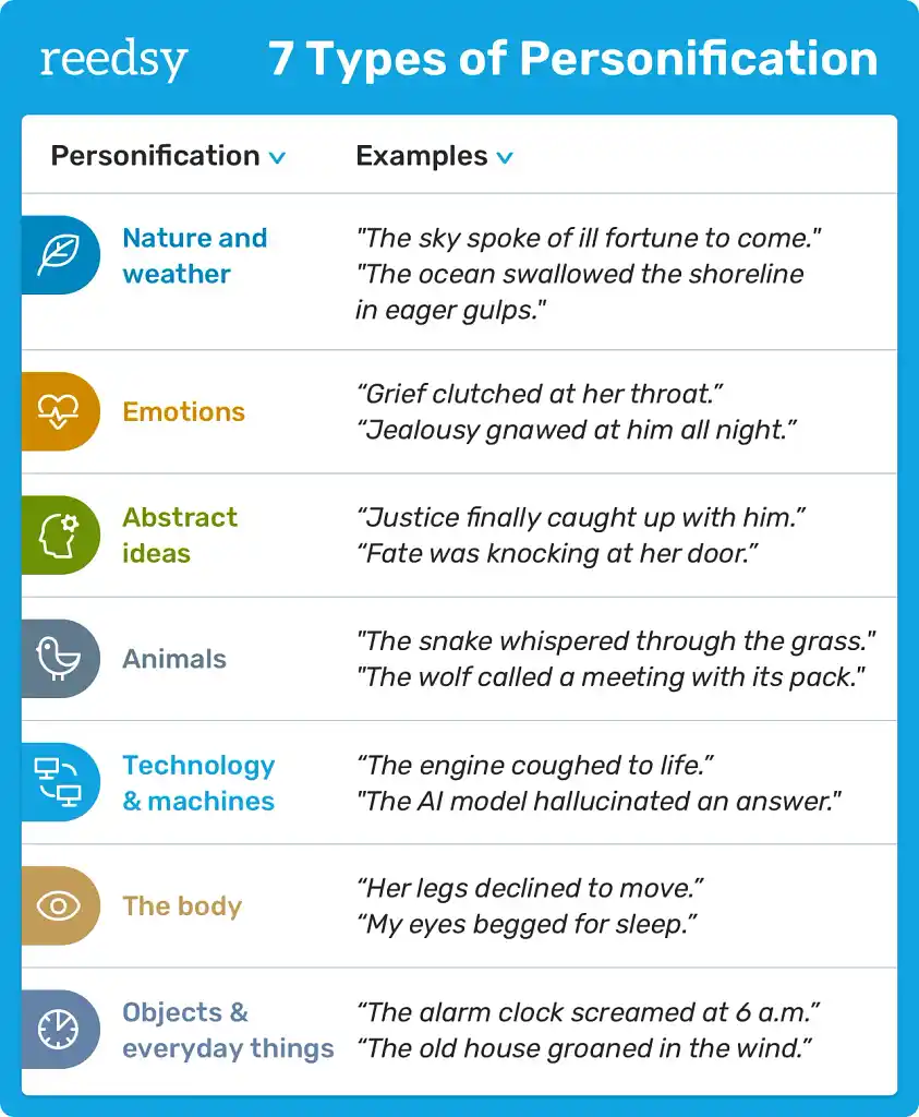 In this article, we’ll go through 7 common types of personification with plenty of examples. Let’s get started: time waits for no one.