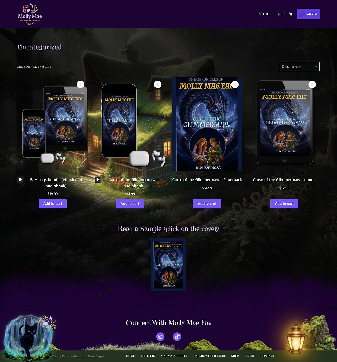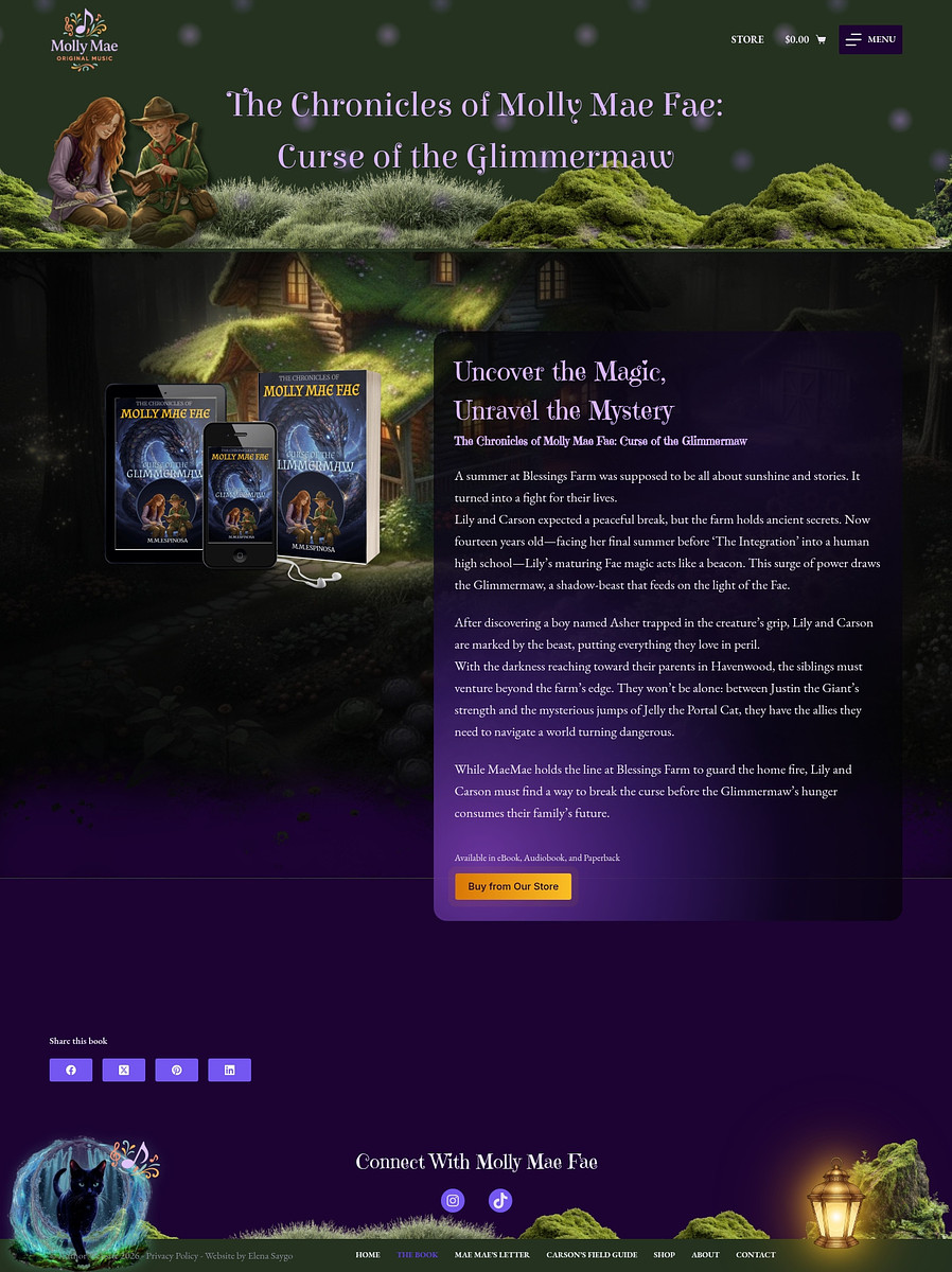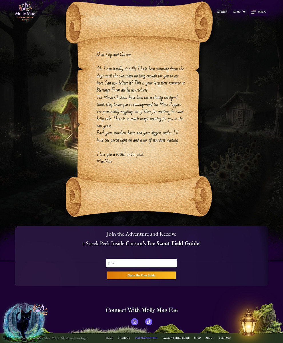 I had lots of fun building this whimsical website featuring a couple of surprises, like music playing when a magical cat is activated, or a mystery letter hidden behind a lantern. The website features a store to sell the book in both physical and digital formats, as well as original music.