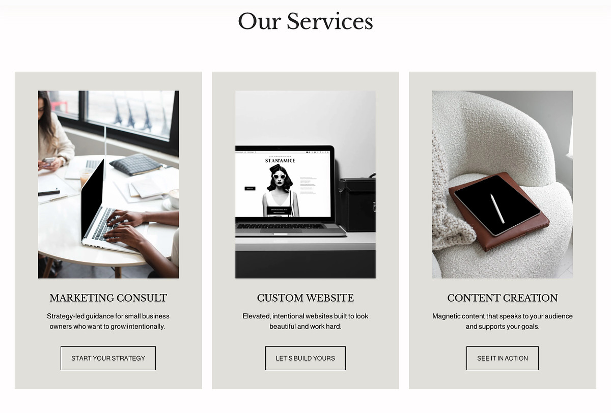 This website demonstrates my ability to create a cohesive online presence that not only reflects the brand's personality but also strategically guides visitors toward becoming clients.