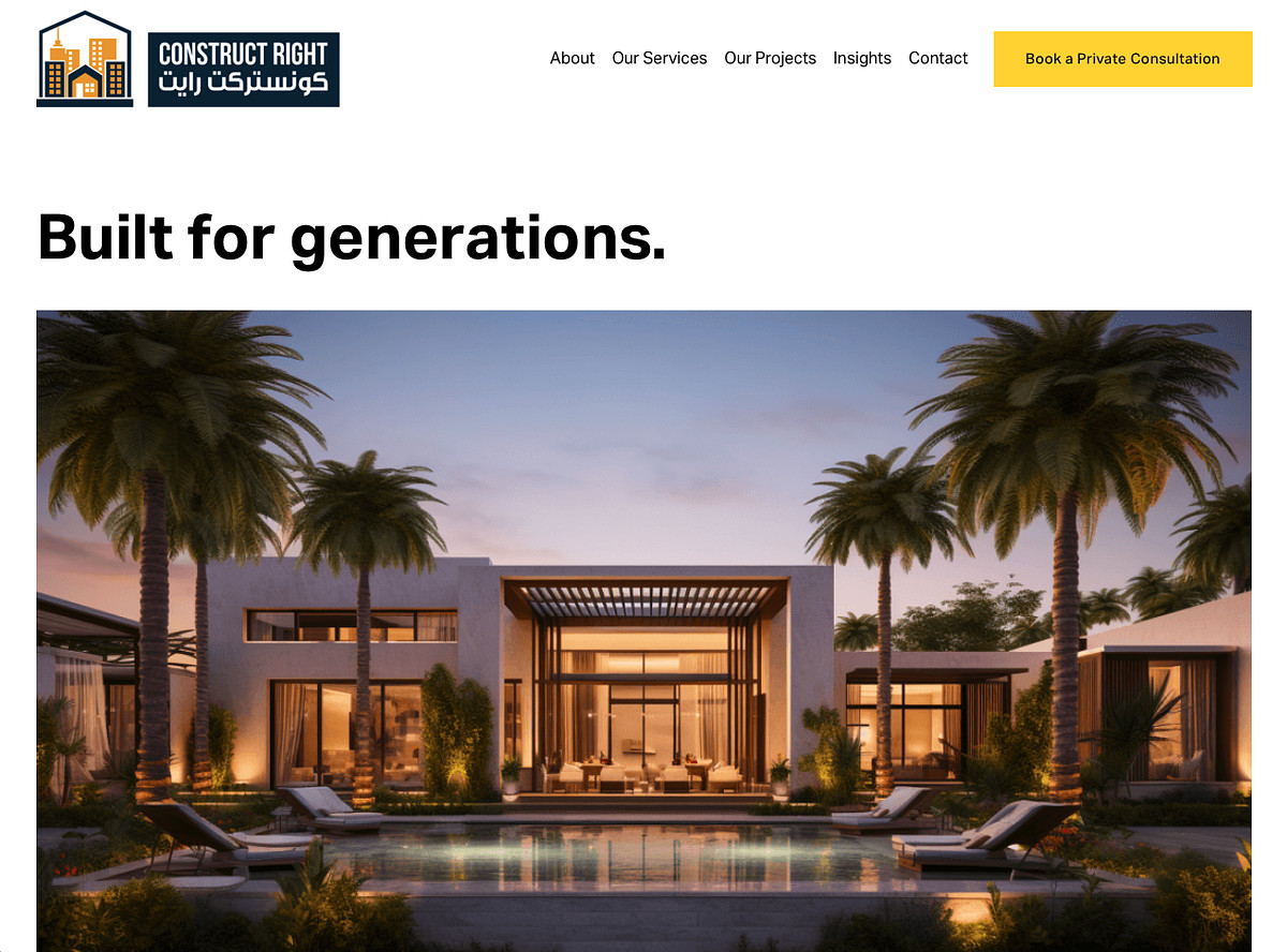 This modern, trust-focused website was created for Construct Right, a UAE-based home construction company committed to building high-quality residences that last for generations. The design blends aspirational imagery with clear messaging to convey reliability, craftsmanship and family values.