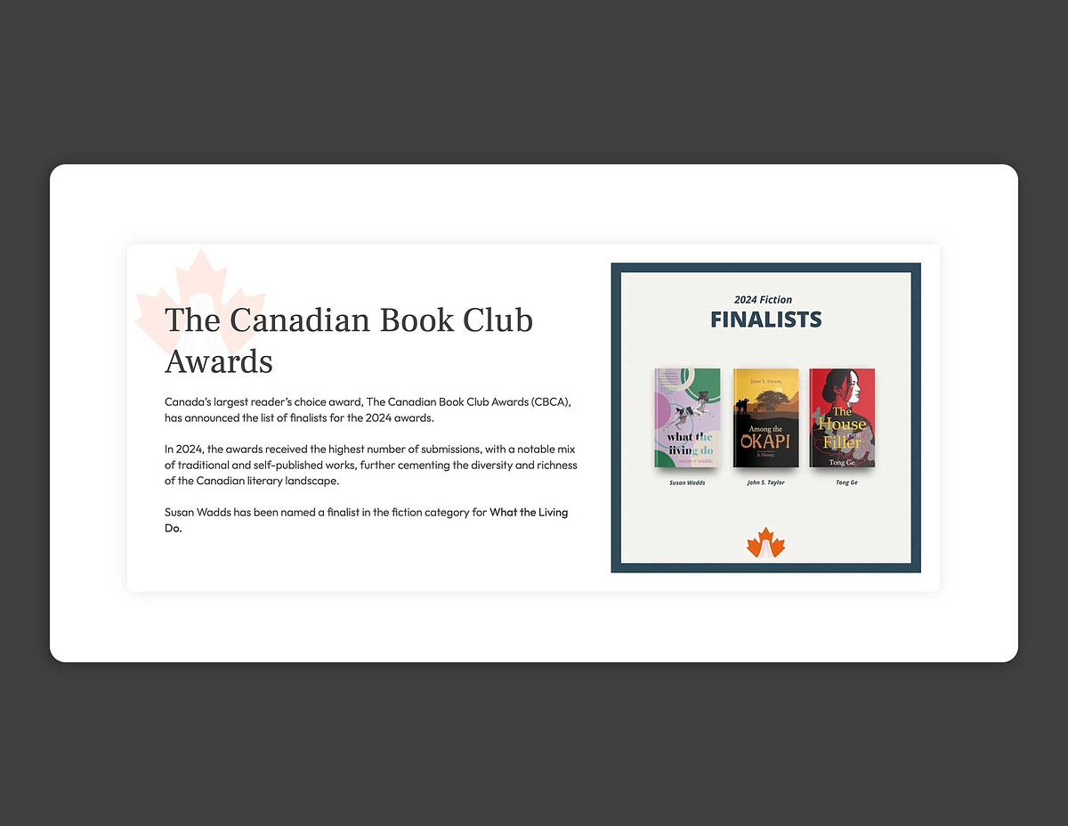 I built a clean, professional WordPress site for award-winning women's fiction author Susan E. Wadds, showcasing her debut novel What the Living Do (Regal House, 2024) and her AWA-certified writing workshops/retreats.